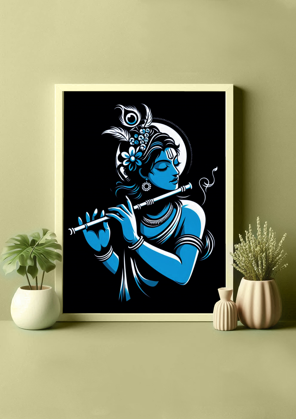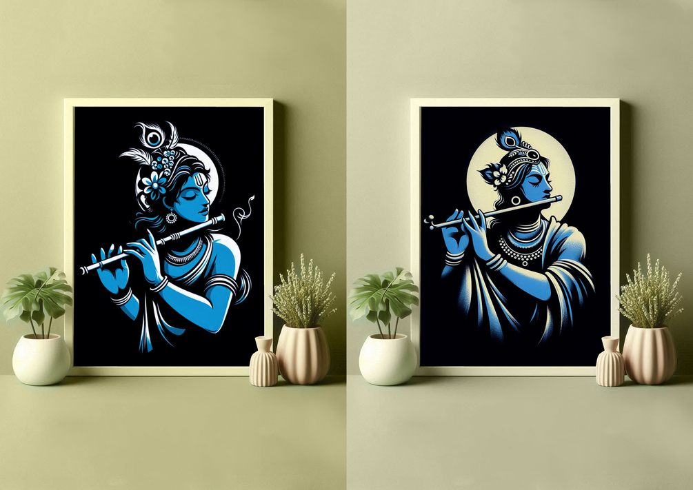 Adorn your walls with this stunning depiction of Lord Krishna ( Set of 2 Prints ) playing the flute, rendered in an elegant blue and black minimalist style. This A4-sized unframed art print is perfect for adding a touch of spirituality and elegance to your living space, meditation room, or office.